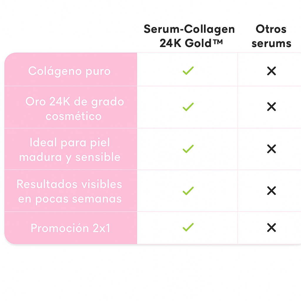 Su formula combina colágeno hidrolizado con partículas de oro puro para estimular la regeneración celular, hidratar en profundidad y reducir visiblemente los signos de la edad. Ideal para mujeres entre 25 y 55 años que desean un cambio real sin procedimientos invasisvos.